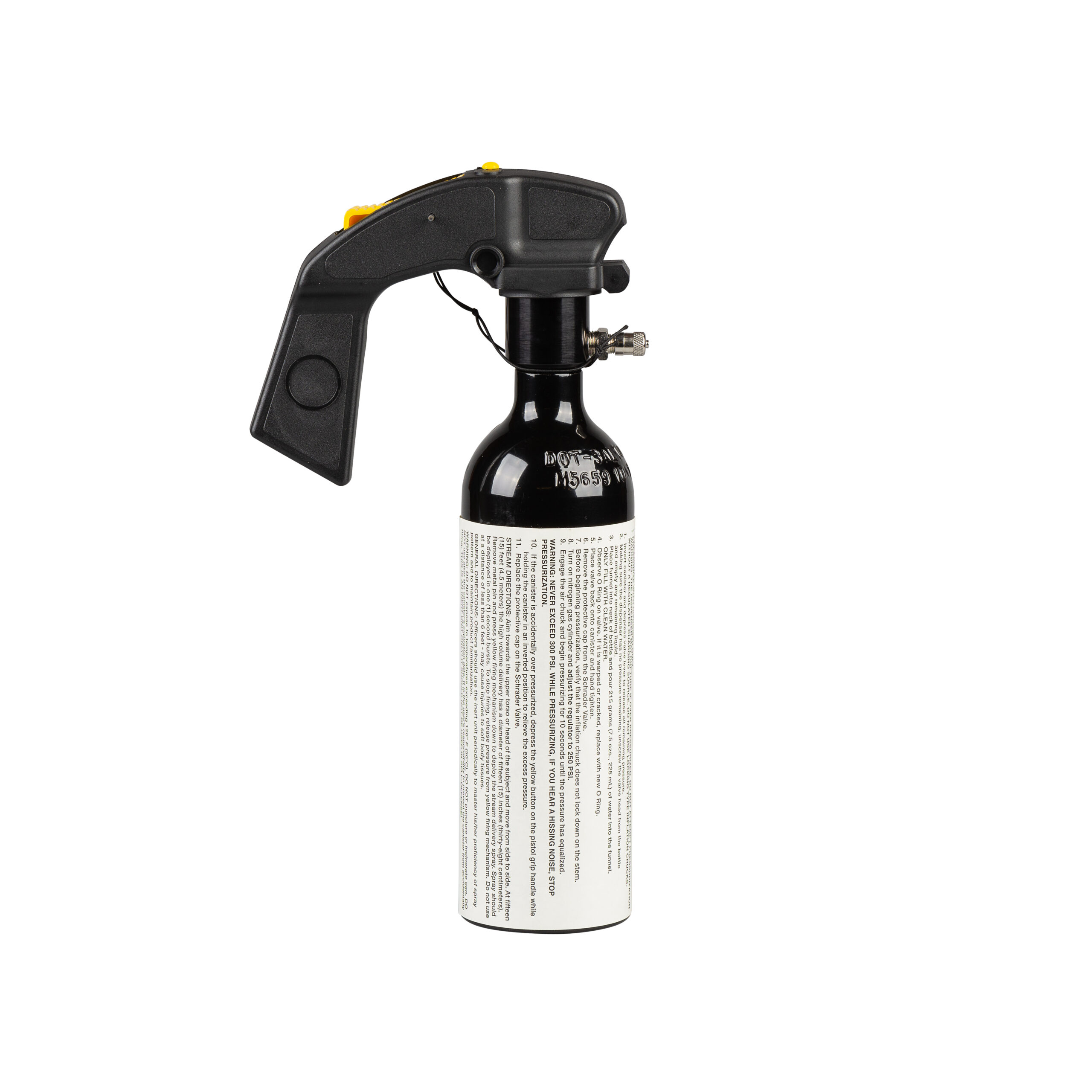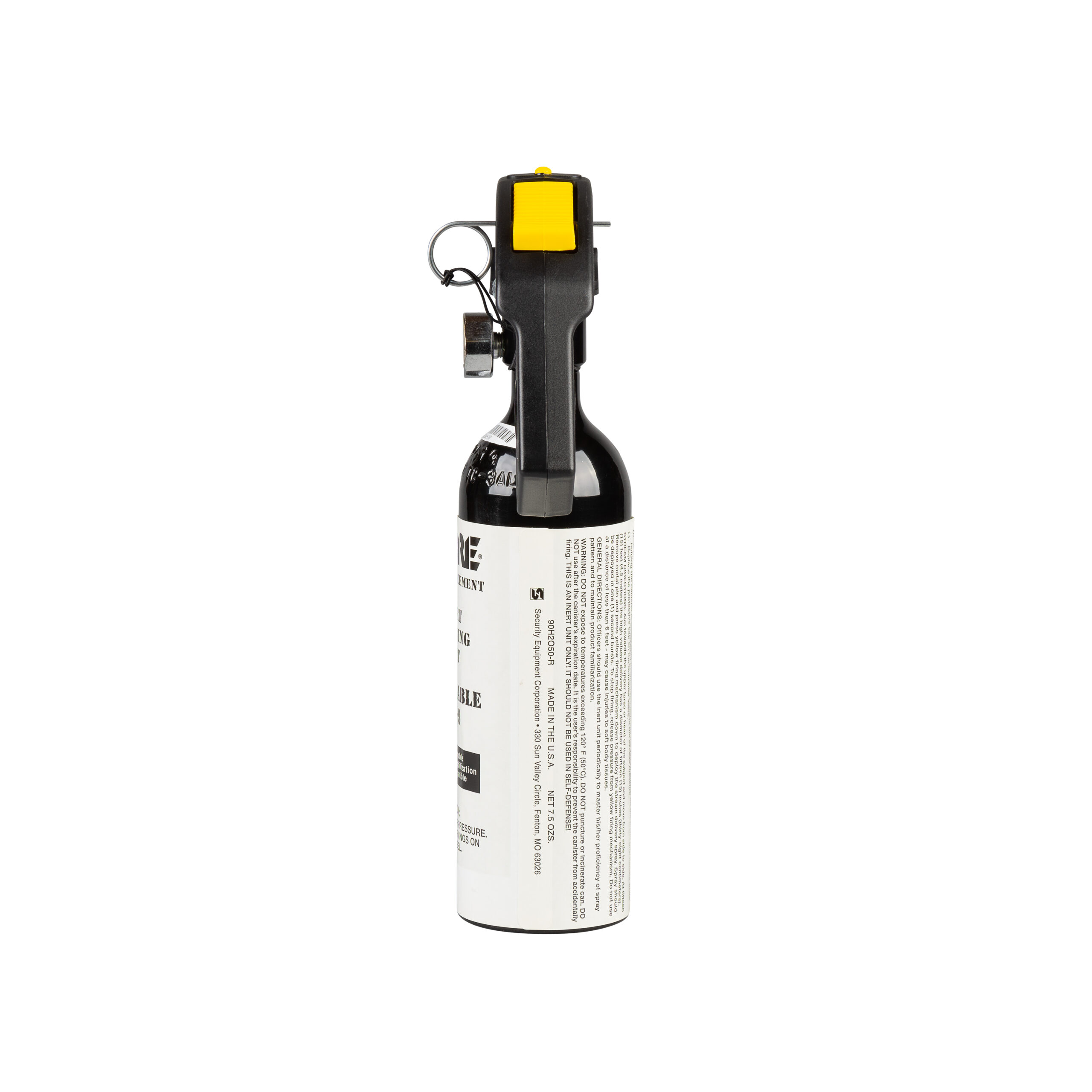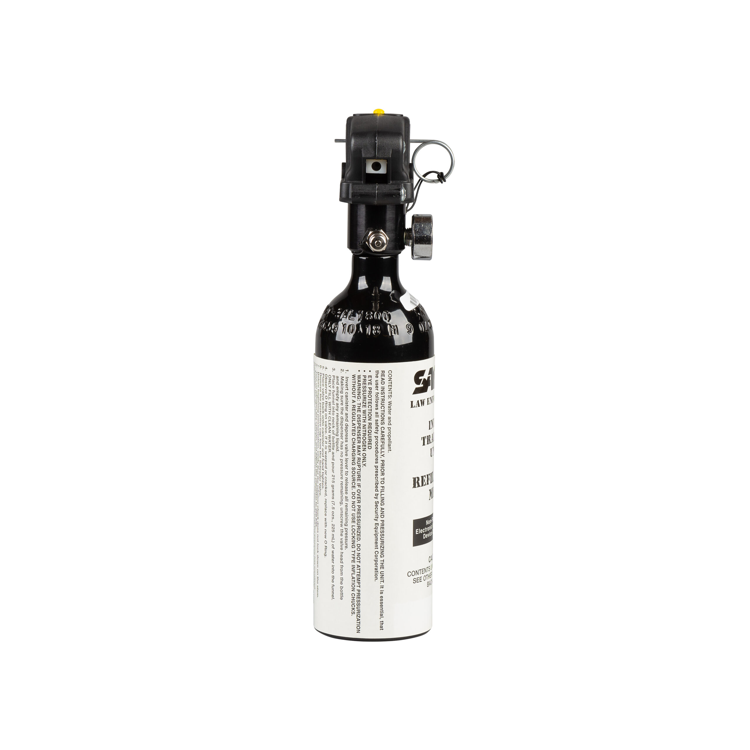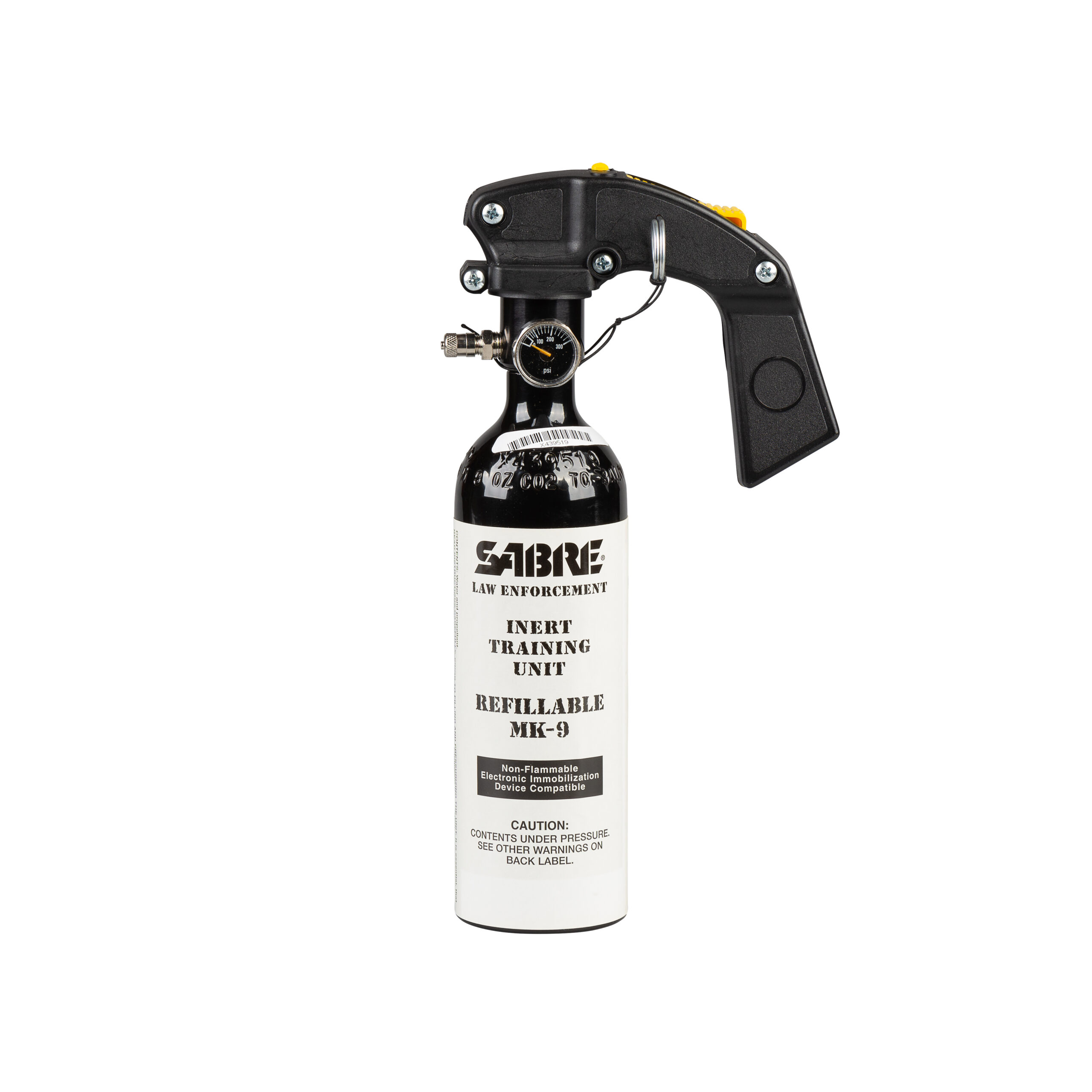The SABRE 90H2O50-R Inert 12.0 oz. MK-9 High Volume Streamer deploys seven (7) full one (1) second bursts at a range of 25 to 30 Ft. The MK-9 utilizes a pistol grip handle with safety tab and pin to prevent accidental discharge. All SABRE MK-9 pins are equipped with a safety lanyard. SABRE Inert training sprays deploy just like active sprays yet are designed specifically for training utilizing an inactive formula. The MK-9 Training System includes the refillable canister, refill bottle, funnel, and O-ring.